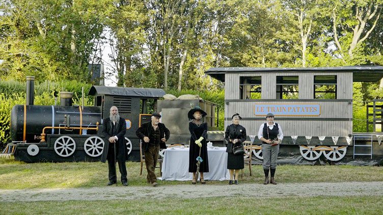 LE TRAIN PATATE Comme partout, l'arrivée du train fut un énorme succès. Il changea la vie des habitants en leur permettant d'élargir considérablement leur rayon d'action. Les agriculteurs pouvaient desservir tous les marchés environnants et le train fut surnommé le train patates. Derrière la locomotive, le convoi était constitué en fonction des besoins du moment de 4 à 10 wagons selon les jours et selon les saisons. Plusieurs wagons pour les passagers, un fourgon à bagages, un autre pour les marchandises et deux ou trois pour les animaux, poules, cochons, vaches et chevaux. Sa lenteur était telle que les voyageurs pouvaient descendre des wagons pour une pause "pipi" ou cueillir quelques fleurs. Et quand il peinait de trop dans les côtes, les hommes descendaient pour le pousser Le tronçon Landerneau-Plouénour-Trez (28 km) est inauguré le 11 juin 1894. Il sera prolongé jusqu'à Brignogan (soit 30 km au total) le 11 août 1901, pour permettre aux voyageurs de rejoindre directement les plages.Tout le long du parcours, des omnibus à chevaux attendent les voyageurs pour les déposer dans les hôtels ou aux bourgades voisines. Plus tard viendront les véhicules à pétrole, puis les autobus, ce sera alors la fin du train patates.